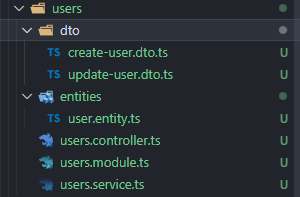 根据生成的 users 模块可以看到主要分为控制器(controller)、提供者(service)、模块(module)、实体类、dto 文件。